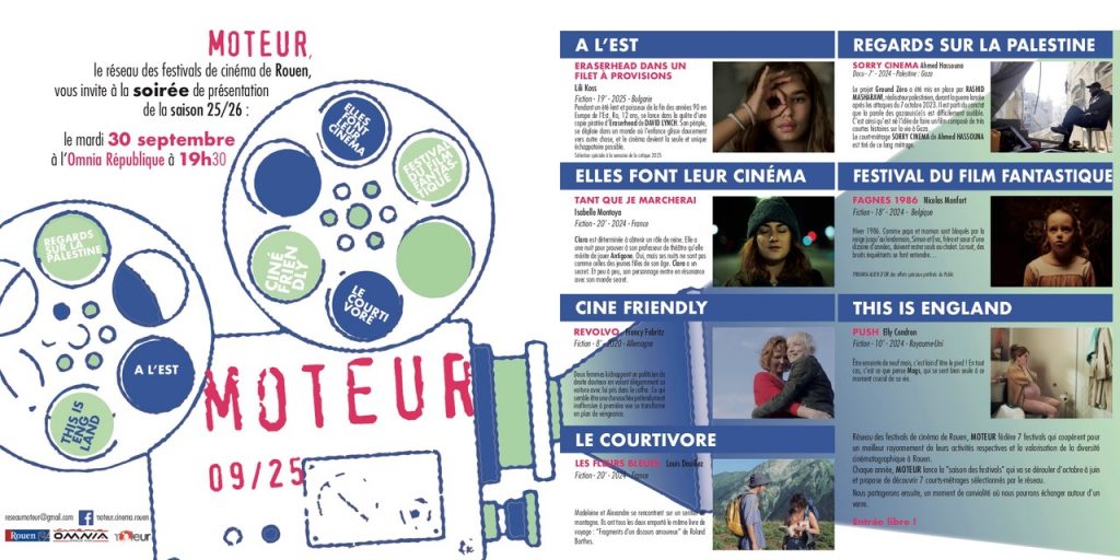 Moteur, le réseau des festivals de cinéma de Rouen Auteur/autrice de la publication :Pix'M Publication publiée :septembre 12, 2025 Post category:News Commentaires de la publication :0 commentaire C’est la rentrée !Le 30 septembre aura lieu la soirée Moteur, le réseau des festivals de cinéma de Rouen à 19h30 à Omnia République pour découvrir la sélection de courts métrages proposés par les festivals:Festival – Elles font leur cinémaCourtivoreThis is England – Rouen Film FestivalFestival À l’EstFestival du film fantastiqueRegards sur la Palestine Et votre festival adoré Ciné Friendly by Pix’M qui a choisit le court-métrage allemand réalisée par Francy Fabritz.Ci-dessous le programme détaillé.Séance gratuite dans la limite des places disponibles.#cinema #courtsmetrages #queer #lesbien Vous devriez également aimer Jury Fédération des festivals de films LGBTQI+ janvier 14, 2025 La Petite Dernière octobre 7, 2025 LESVIA décembre 30, 2024 Laisser un commentaire Annuler la réponseCommentEnter your name or username to comment Enter your email address to comment Saisir l’URL de votre site (facultatif) Enregistrer mon nom, mon e-mail et mon site dans le navigateur pour mon prochain commentaire.
